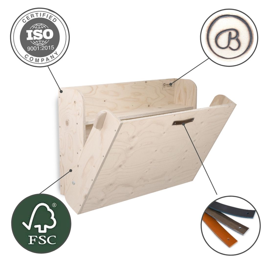 Het hout waarvan e opklapbare commodes worden geproduceerd is FSC gecertificeerd. Het hout is duurzaam omdat het FSC gekeurd is. De Forest Stewardship Council (FSC) is dé internationale organisatie die zich inzet voor behoud en verantwoord bosbeheer wereldwijd. FSC spreekt van verantwoord bosbeheer als op evenwichtige wijze rekening wordt gehouden met de ecologische, economische, sociale aspecten. Om bossen vruchtbaar te houten. Zo is de commode een echt natuurlijk meubel.